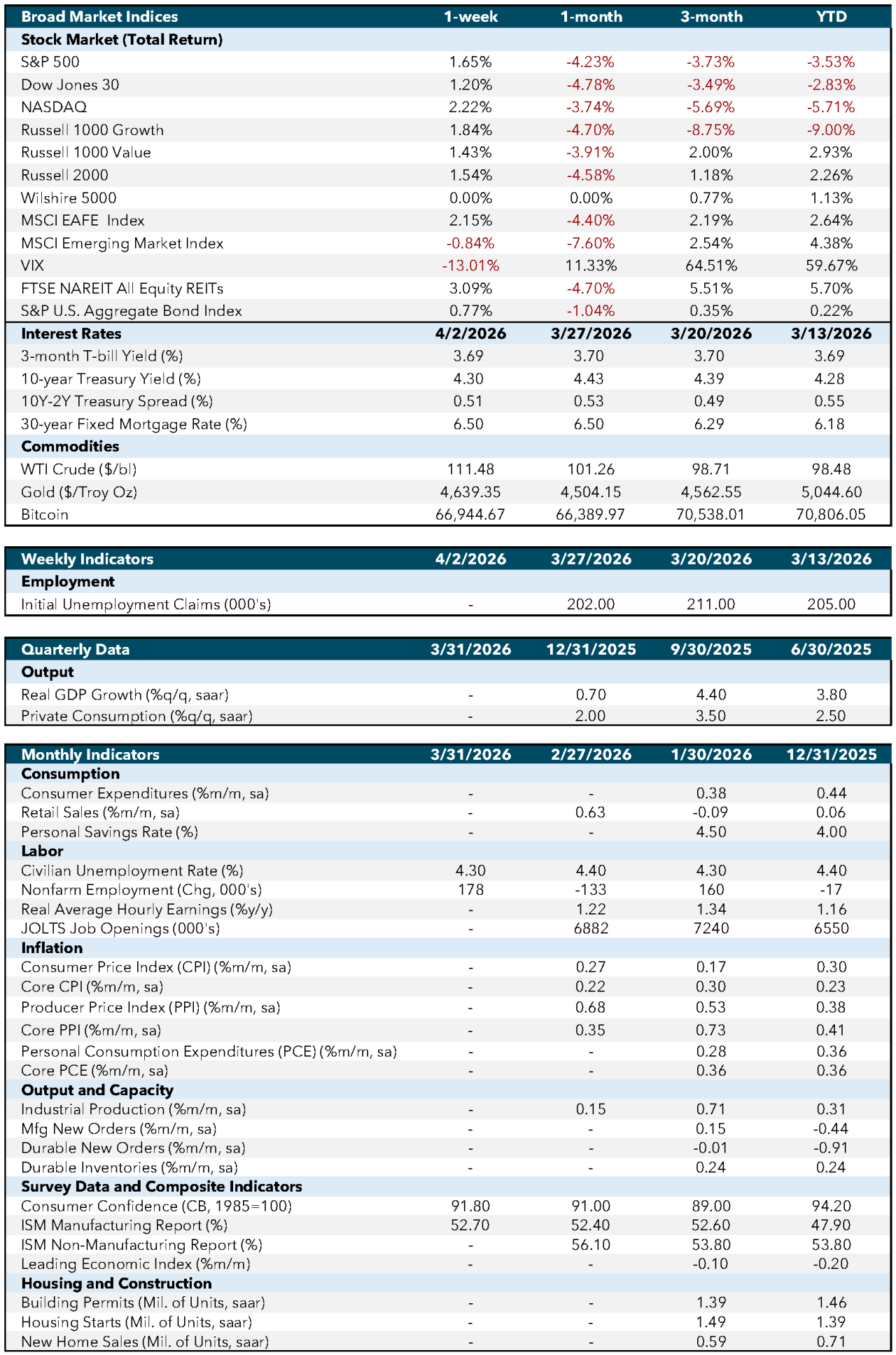 Labor market data remained relatively stable. ADP reported an increase of 62,000 private‑sector jobs in March. Initial jobless claims declined to 202,000, remaining near recent lows. The March employment report showed nonfarm payroll growth of 178,000, while the unemployment rate edged down to 4.3%. Average hourly earnings increased 0.2% month-over-month, reflecting a slower pace of wage growth compared with earlier periods.